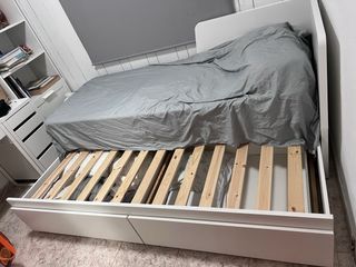 Cama individual doble de 80x200 cm en color blanco, en buen estado. Incluye dos colchones, las sabanas de la foto para los dos colchones y dos cajones amplios para almacenamiento. Perfecta para una habitación pequeña. - Medidas: 80x200 - Color blanco - Dos cajones espaciosos Precio negociable