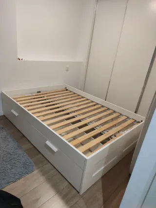 Estructura de cama modelo Brimnes de Ikea, con medidas de 140x200 cm. Cuenta con cuatro amplios cajones integrados para almacenamiento. - Cajones con tiradores discretos. - Diseño moderno y funcional. - Somier de lamas de madera modelo Lindbåden La cama ha sido usada durante 2 años y después se conservó desmontada durante 1 año. Se encuentra en buen estado. Recogida a cargo del comprador. El mueble se encuentra desmontado.