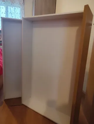 Cama nido de color blanco con dos cajones integrados. Estructura de madera. La cama cerrada mide 80x200, abierta se convierte en una cama de 160x200. Solo una lama está rota, pero tengo las dos partes para reparar. Por lo demás está en perfecto estado. Lo tengo ya desmontado.