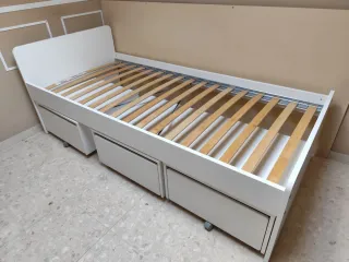Cama individual de la marca Ikea, modelo Slakt, en color blanco. Ya no tengo los cajones. Cuenta con un diseño moderno y funcional, ideal para optimizar el espacio. - Estructura principal de madera. - Base de listones de madera, es enrollable para facilitar el transporte. Hay dos láminas que están reparadas con cinta americana pero hasta ahora ha dormido en ella un chico de 14 años sin problemas. - Actualmente está desmontada - Posibilidad de transporte en pueblos cercanos a Sabadell
