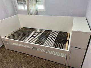 Estructura de cama individual juvenil Flaxa de Ikea, en blanco y con 2 amplios cajones a contraste en negro. Mide 207x98x44,5 cm. Incluye somier de lamas Lonset. Todo en perfecto estado. El colchón Matrand Viscoelástica de 190x90 cm lo vendo por 75€ adicionales, si te lo llevas todo. A recoger en el centro de Valencia, zona El Carmen.