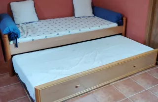 Cama nido de madera con un cajón inferior y dos colchones de espuma.NEGOCIABLE - Medidas de la cama: 80x180 cm. - Incluye dos colchones de espuma. - Estructura de madera. - Cajón de gran capacidad.