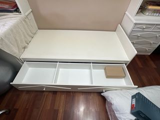 Cama nido de color blanco con espacio de almacenamiento. - Tres cajones integrados. - Diseño funcional para habitaciones. - Fabricada con materiales resistentes. - Colchones incluidos. Se vende por cambio de decoración.