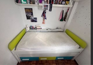 Cama individual con un diseño moderno y funcional. Cuenta con un espacio de almacenamiento debajo o segundo colchon. - Estructura de madera. - color madera claro En perfecto estado parte de abajo correduza Es bastante alta. La vendo sin colchon en 300€ y con ambos colchones en 380€