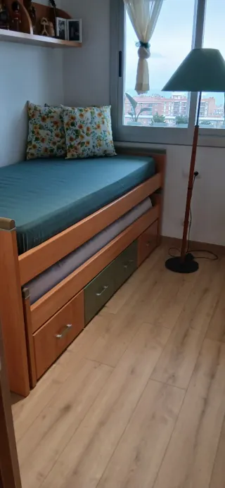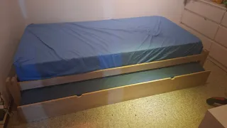 Se vende cama nido en perfecto estado Se ofrece cama nido doble en muy buen estado, ideal para habitaciones infantiles o juveniles. La cama superior incluye colchón y está decorada con un juego de sábanas temático de dibujos animados. La cama inferior se desliza fácilmente y también incluye colchón. El mueble cuenta con estructura resistente, acabado en color claro, y ofrece un práctico espacio de almacenamiento en la parte inferior. Incluye además una estantería de pared a juego, perfecta para libros, trofeos o decoración. Perfecta para ahorrar espacio y mantener la habitación organizada. Lista para usar de inmediato.