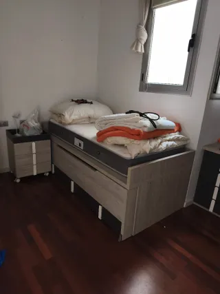 Se vende habitación completa. (Aceptamos compras de muebles por separado; PRECIO NEGOCIABLE) Cama nido individual 200x100 Cm con un somier y cajones (120€): - Estructura de madera clara. - Tres cajones amplios. - Somier de láminas. - 1 Colchón disponible (80€) Escritorio 230x50 Cm amplio y funcional, ideal para estudiar o trabajar desde casa (100€): - Estructura de madera clara. - Dos cajones frontales. - Cajón interior oculto. Armario de 3 puertas 150x240x55 Cm (150€): - Estructura de madera clara. - 2 cajones frontales. - Barra de metal para perchas.