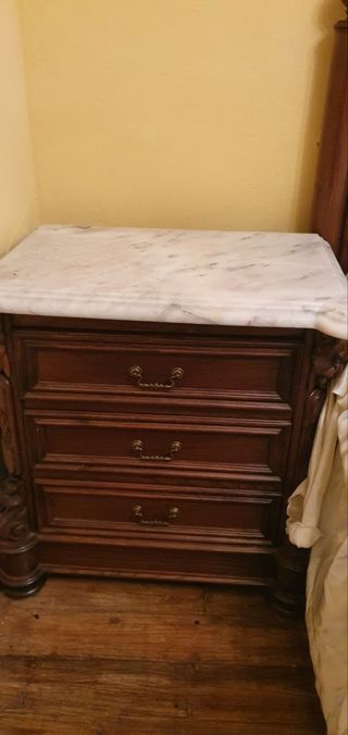 Cama de matrimonio y somier. 2 Mesitas de cama con cajones y mármol en su parte superior. Todo es de madera maciza. NO HAGO ENVIOS, A RECOGER AL LADO DE CISTIERNA (LEON).