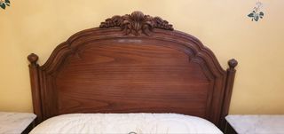 Precioso dormitorio de matrimonio de madera maciza. Se compone de una cama con cabecero y dos mesitas de noche con cajones. La madera luce en excelentes condiciones, con un hermoso acabado. - Cama con cabecero tallado. - Dos mesitas de noche con cajones y tiradores de bronce. - Estilo clásico elegante. Se encuentra en un pueblo de Palencia hay que venir a desmontarle ,no incluye ni colchón ni colcha
