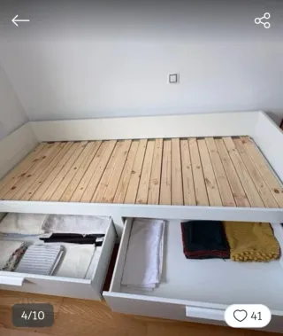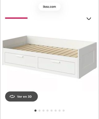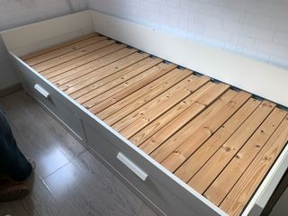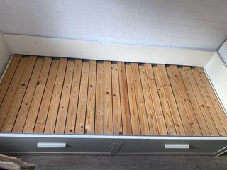 Cama diván de Ikea con un diseño moderno y funcional. - Dos cajones amplios para almacenamiento. - Estructura de madera robusta. - Somier de láminas incluido. - Se vende desmontada. - Tiene desperfectos al haberse mojado, de ahí su precio. - Urge por mudanza.