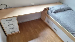 Disponible hasta finales de abril Para las medidas no dudes en preguntar Conjunto de muebles para habitación infantil o juvenil que combina una cama con un escritorio. - Zapatero bajo escritorio. - Estructura de madera. - Cajones blancos: 42cm ancho×75cm alto - Escritorio en forma de L: 260cm×54cm