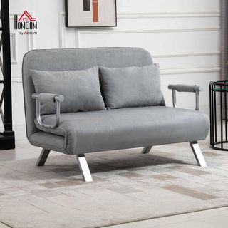 Sofá cama de 2 plazas convertible en cama individual, dimensiones del sofá: 111L x 80P x 78A cm, dimensiones de la cama: 185L x 105P x 27A cm. Cubierto en suave cuero sintético, acolchado con espuma de densidad media para comodidad y soporte. Estructura de acero pintado en polvo, resistente y duradera, con capacidad de peso de hasta 240 kg. Respaldo regulable en 5 posiciones para una comodidad personalizada. Incluye 2 cojines con fundas extraíbles para fácil limpieza. Montaje requerido. Color: gris claro.