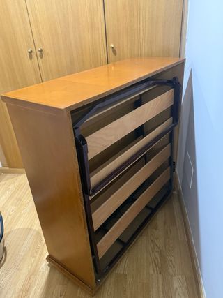 Cama plegable que aparenta ser un armario con cajones Colchón 170 x 90 cm Medidas mueble con cama plegada: Ancho 100 cm Profundo 40 cm Alto 100 cm - Acabado en madera de cerezo.