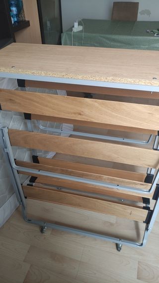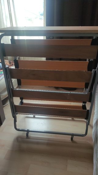 Cama plegable con estructura metálica y somier de láminas de madera. Ideal para invitados o espacios reducidos. c - Fácil de plegar y guardar. - Ruedas para un desplazamiento cómodo.omprada en septiembre de 2025. Solo 3 semanas de uso. uando la cama está abierta mide 200x90cm