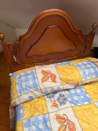 Elegante cama individual de estilo vintage en madera maciza. Su diseño clásico y los detalles tallados le dan un toque especial. La estructura de cama está casi nueva. Cama de 90cm de ancho. Incluye almohada, sábana, colchón y somier. Lista para usar.