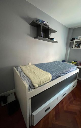 Conjunto de dormitorio juvenil en perfecto estado. Incluye cama nido con cabecero, dos mesitas de noche y una cómoda. Los muebles son de color gris y madera clara, combinando estilo y funcionalidad. - Canape de 90x190 cm 190€ - Cabezero 85€ - Colchon de 90x190 cm 120€ - Dos mesitas de noche 65€c/u - Cómoda 120€ - Sinfonier 100€
