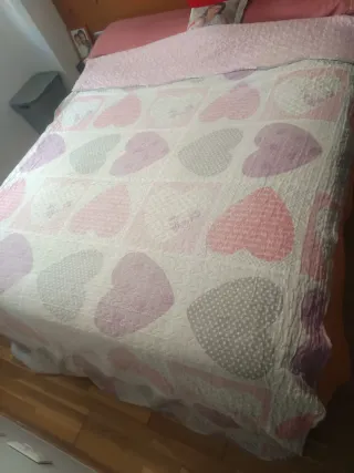 Colcha bouti con un bonito estampado de corazones en tonos grises y rosas. Ideal para camas individuales. - Medidas: 180x270 cm. - Diseño reversible.