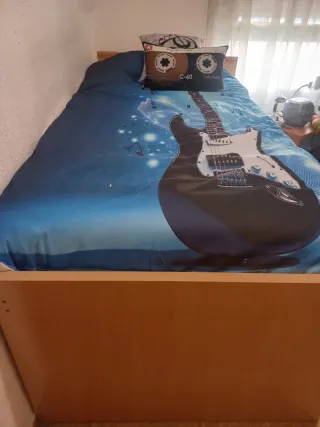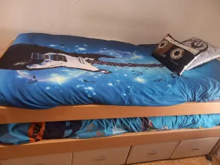 Cama juvenil de madera con un diseño moderno.color claro.son 2 camas.la de abajo extraible.perfecta por si tienes invitados.lleva abajo 4 cajones extraibles.con gran capacidad.esta en perfecto estado.. - Medidas: 90x200 cm.+ REGALO 2 colchones y 2 fundas nórdicas + 2 fundas de almohada de TOY STORY.se recoge en valencia.