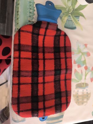 Bolsa de agua caliente con un diseño a cuadros clásico. La parte exterior es de franela suave y la bolsa interior es de goma resistente. - Diseño a cuadros en rojo y negro. - Cubierta de franela. - Bolsa interior de goma.
