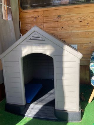 Casa para mascotas de plástico resistente. Ideal para exteriores. - Diseño de casa con tejado a dos aguas. - Puerta de entrada arqueada. - Ventilación en la parte superior.
