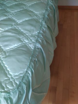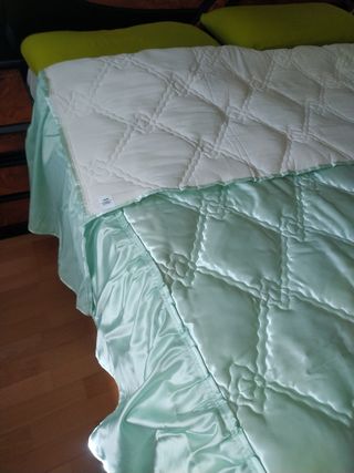 Preciosa colcha bouti en tonos verdes y blancos. Ideal para dar un toque de elegancia a tu dormitorio. - Diseño de rombos acolchados. - Nueva - Borde con volantes de satén.