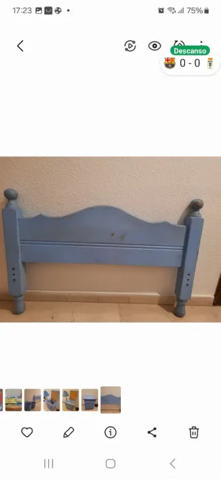 Conjunto de cabecero de cama y mesilla a juego. - Diseño clásico y elegante. - Acabado en color azul. Son de madera de pino natural. La pintura es "pintura al agua" por lo que se puede quitar fácilmente. Ideal para restaurar.