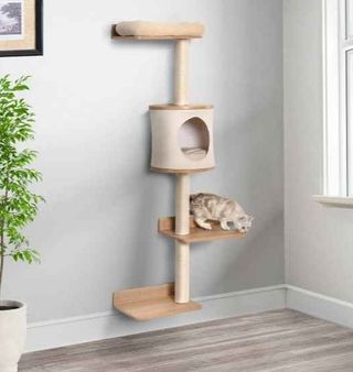 - Árbol para gatos de diseño vertical montado en la pared para aprovechar eficientemente el espacio - Incluye una cómoda cama para gatos y una cueva con cojín (lavable en su totalidad) para descansar - Los postes rascadores favorecen el afilado de las garras de tu gato evitando que dañe tus muebles - Hecho de tablero de clase E1 de alta resistente pet-friendly - Material: tablero aglomerado, melamina, sisal y poliéster - Medidas totales: 38x30x149 cm (LxANxAL) - Adecuado para gatos de menos de 5 kg - Referencia: D30-458 - Nota: No recomendable instalar sobre placas de yeso. Para montar en paredes de madera se pueden usar tornillos a
