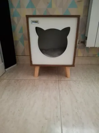 Casita de diseño para mascotas, ideal para interiores. Cuenta con una entrada con forma de silueta de gato y patas de madera que le dan un toque moderno. - Entrada con forma de gato. - Patas de madera.