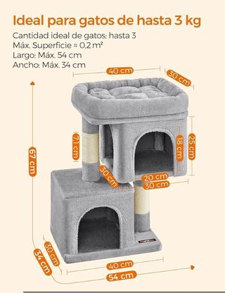 ¡Viene sin libro de instrucciones! Feandrea Árbol para Gatos, Torre de Juegos 67 cm, S, Casa para Gatos de hasta 3 kg, Plataforma Grande, 2 Cuevas, Rascador, Gris Claro PCT611W01 Dimensiones del producto40l. x 30an. x 67al. centímetros Recomendación de razaGatito, razas pequeñas Usos específicos del productoRascar Usos recomendados para el productoInterior MaterialMadera de sisal, Policarbonato Tipo de montajeMontaje en pared [Plataforma grande] Este árbol para gatitos con una gran plataforma de 40 x 30 cm con bordes elevados acolchados, que ofrece un amplio espacio para que tu gatito se estire completamente y se relaje cóm...
