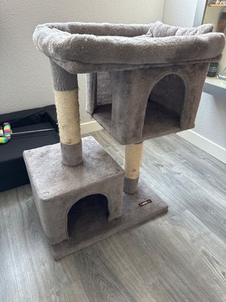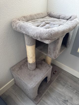 Torre para gatos con varios niveles y postes rascadores. - Cubierta de felpa suave. - Postes forrados de sisal para rascar. - Plataforma superior acolchada. - Cueva o escondite en la base.