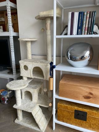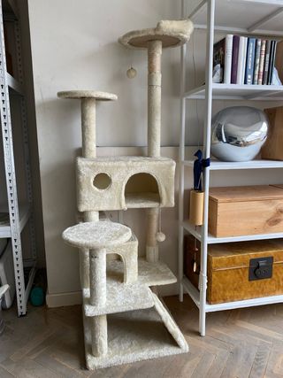 Arbol de gato beige totalmente nuevo, compre dos en amazon y el que esta a la venta nunca lo llegue a montar. El que aparece en las fotos (menos la ultima) es el que tenemos puesto en casa. A los gatos les encanta. Es muy estable y facil de limpiar, de facil montaje tambien. Lo compre por 50€. Se vende tal cual esta en la caja. Solo venta en persona. Se encuentra al lado de la estacion puerta de angel