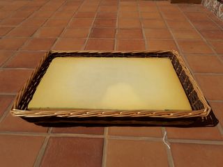 Canasta de mimbre/ cama para perros o gatos, con un colchoncito dentro. Medidas aprox.: 70x46,5cm en el borde exterior y 61x37cm en su base interior.