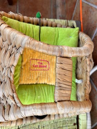 Rascador con forma de casita, ideal para que tu gato juegue y descanse. También sirve de banquito o puff. - Diseño cilíndrico con entrada. - Acabado exterior en mimbre. - Interior y borde superior acolchados. - Está en perfecto estado . - Es para gatitos más pequeños.