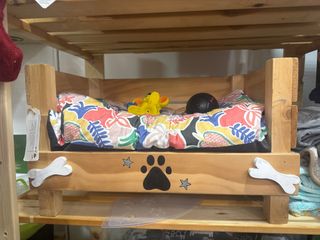 Cama artesanal para mascotas, ideal para perros o gatos. Fabricada con madera. - Diseño único hecho a mano. - Apta para perros pequeños y gatos. - Incluye cojín con estampado floral.