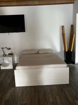 Cama doble de 135x190 con somier y colchón. - Somier de madera separable en dos para fácil transporte. - Colchón viscoelastico, siempre ha estado recubierto con una funda impermeable, por lo que está en perfecto estado y limpio. - A recoger en Barcelona, calle Roger de Flor.