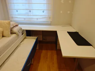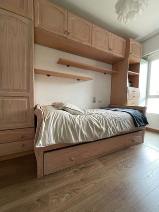 Se vende URGENTEMENTE el conjunto entero (muebles + cama) por traslado. CONJUNTO: -Cama Nido Mejorada (1,80 x 0,90m): La base NO es un somier de láminas básico; se ha cambiado recientemente por una tapa dura tapizada para mayor firmeza y confort. -Doble utilidad: El cajón inferior es enorme. Actualmente se usa como gran espacio de almacenaje, pero conservo la estructura original para montar una segunda cama si se prefiere. -Todo organizado: Armario alto de dos puertas, altillos profundos, estanterías y una cajonera lateral de 7 cajones. PRECIO NEGOCIABLE