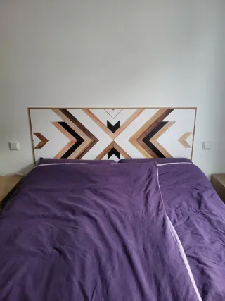 Cabecero de cama con un diseño geométrico y moderno, imitando la veta de la madera. Muy fácil de colgar a la pared, por ejemplo con cinta de doble cara, sin agujeros!!! - Material: PVC de 5mm de grosor. - Medidas: 150cm de largo. - Diseño: Geométrico con efecto madera. - Tara de fabricación: linea color rojizo en el dibujo y una de las esquinas está un poco doblada (como muestro en las imágenes). Entrega en mano.