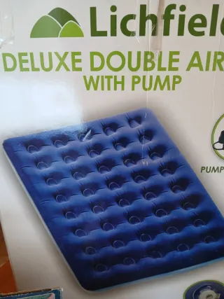 Colchón hinchable doble de la marca Lichfield, ideal para camping o invitados. Incluye bomba para inflarlo fácilmente. - Color azul. - Fabricado en plástico resistente.