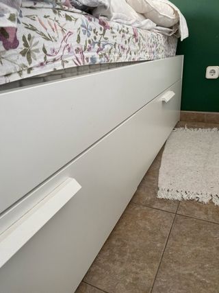 Cama doble Brimnes de 140x200 cm con espacio de almacenamiento integrado. - Dos cajones amplios. - Diseño moderno y funcional. Se recoge desmontado. Entre el 15 y el 30 de diciembre.
