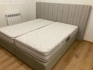 cama doble tapizada en color verde pastel. Medidas: dos colchones de 90x1.90 cabezal tapizado de calidad-largo: 2.20- alto: 1.22