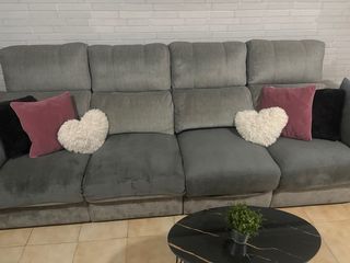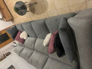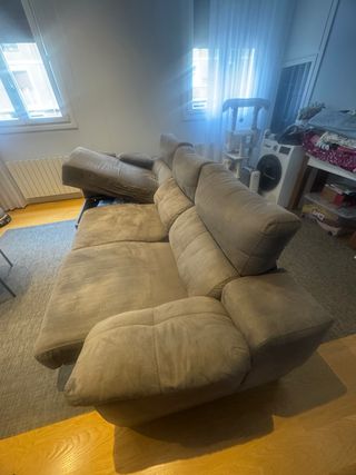 Sofá de dos plazas extensible muy cómodo. Al mudarme me di cuenta de que tenia una cremallera rota en la parte de atrás ( se ve en una foto) aunque no afecta en el uso. - Tapicería de tela. - Estructura extensible. - Caben tres personas - cuando se abre aprox mide 120cm de fondo -se desmonta en módulos para facilitar el transporte - los respaldos son reclinables por separado
