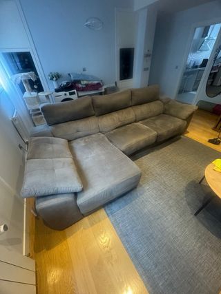 Sofá de tres plazas con la opción de extenderse para convertirse en cama. Su diseño moderno y cómodo lo hace ideal para cualquier salón. Muy poco uso, se compró hace muy poco tiempo por (2400€). urgente su venta el precio de la venta es 1200€ un poco negociable Nota: en la fotos se cambia color es la claridad del exterior cambio color - Tapicería de tela. - Color beige y gris.
