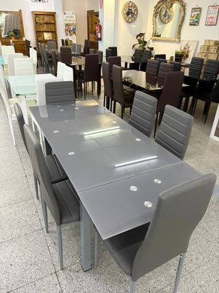 Conjunto de mesa extensible con superficie de cristal y seis sillas a juego. 🚚 Envío a todo España 💶 Pago CONTRAREEMBOLSO (paga al recibir) 🛋️ Muebles NUEVOS de fábrica – sin intermediarios 📌 Sofás, dormitorios, terrazas, aparadores, camas y mucho más. 📲 Escríbeme por WhatsApp: 658469843 Pregunta sin compromiso – ¡respondo rápido!