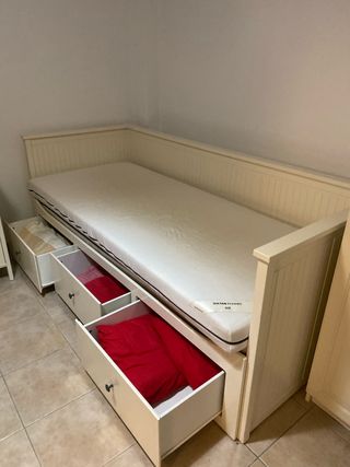 Diván extensible Hemnes de IKEA, perfecto para aprovechar el espacio. - Estructura de madera blanca. - Tres cajones amplios. - 2 Colchones incluidos.