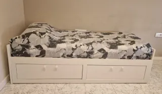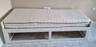 Cama extensible que se adapta a tus necesidades, pasando de 80cm a 160cm. Incluye prácticos cajones para almacenamiento. - Estructura blanca. - Dos cajones frontales. Se vende con los 2 colchones de la imagen, muy cómodos. Roces de la estructura por el tiempo visible en las fotos. Cualquier duda contactad sin compromiso.