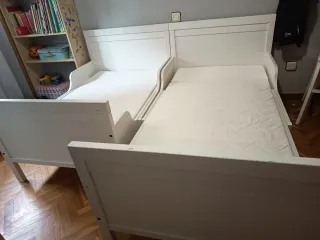 Vendo pack completo de 2 camas IKEA SUNDVIK extensibles (80×200 cm), con somieres y colchones ÖMSINT incluidos. Todo en estado excelente, usado solo 6 meses. Incluye: ✔ 2 estructuras SUNDVIK blancas ✔ 2 somieres LÖNSET/LURÖY ✔ 2 colchones ÖMSINT (muelles ensacados, comodísimos) ✔ Laterales de protección integrados ✔ Diseño robusto y de calidad Perfectas para la transición de cuna a cama o habitación compartida. 📌 Muy poco uso 📌 Sin manchas ni daños 📌 Se entregan montadas o desmontadas según prefieras 📍 Entrega en Zaragoza.
