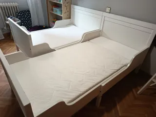 Cama infantil extensible modelo BUSUNGE de Ikea con colchón incluido. Se puede alargar a medida que crece el niño añadiendo los módulos de colchón. Nueva cuesta 199 euros la cama y 139 euros el colchón. - Diseño moderno y funcional. - Estructura robusta. - Colchón incluido.