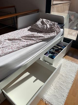 Cama extensible de Ikea en color blanco. Cuenta con tres cajones para almacenamiento. - Estructura de madera. - Tres cajones frontales. - Diseño moderno y funcional. * LAS FOTOS SON DE IKEA PORQUE LA CAMA ESTÁ DESMONTADA. * LA CAMA ESTÁ EN MUY BUEN ESTADO. * EL PRECIO ES DE LA CAMA Y DEL COLCHÓN. Ikea vende la cama y el colchón separados.
