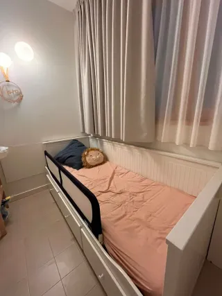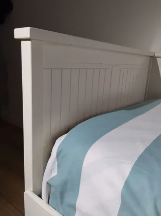 Vendo cama extensible BRIMNES de IKEA en buen estado. Incluye los 2 colchones y 2 cajones de almacenamiento. Medidas: 80-160x200 Detalle a tener en cuenta: Una de las maderas está rota (como se ve en la foto), pero solo necesita pegarse o sujetarse — no impide abrir ni usar la cama normalmente. Recogida y desmontaje a cargo del comprador.