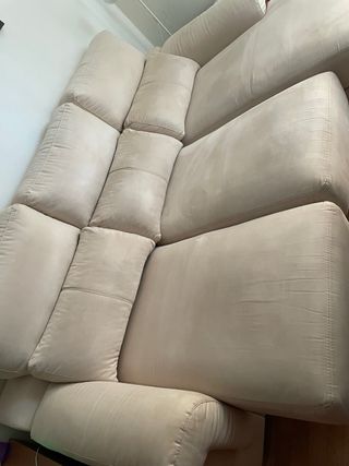 Tapicería especial antimanchas color arroz con leche (similar al ante) Todos los cojines son desenfundables y lavables en lavadora, aunque el tejido es antimanchas. Es de alta calidad visible tanto en costuras, cremalleras como estructura en general. sus medidas; •2 cojines de 70 ancho por 60(extensibles a 103cms como se muestra en las fotos) •cojin chaiselonge 170 largo x 90 ancho •Patas cromadas de altura suficiente para poder limpiar por debajo •Reposacabezas ajustable al gusto •Cojines viscoelásticos súper cómodos! - si te interesa puedes venir a verlo y probarlo-