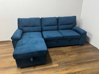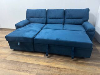 Sofá cama con sistema extensible de arrastre, fácil y rápido de desplegar. Chaise longue con arcón abatible. Tela azul terciopelo. Producto completamente nuevo. Se entrega embalado. Listo para tus invitados en segundos. 📲 639*116*436 - Judith ☎️ ✅Pagos y envios a contra - rembolso ✅ ✅Envios de 1 a 4 dias. ✅ ✅Envio de factura. ✅ ✅Garantia de 2 años.✅ ✅Productos completamente Nuevos ✅ ☎️ Tienes dudas? , no dudes en comunicarte con nosotros, atendemos 24HRS.☎️